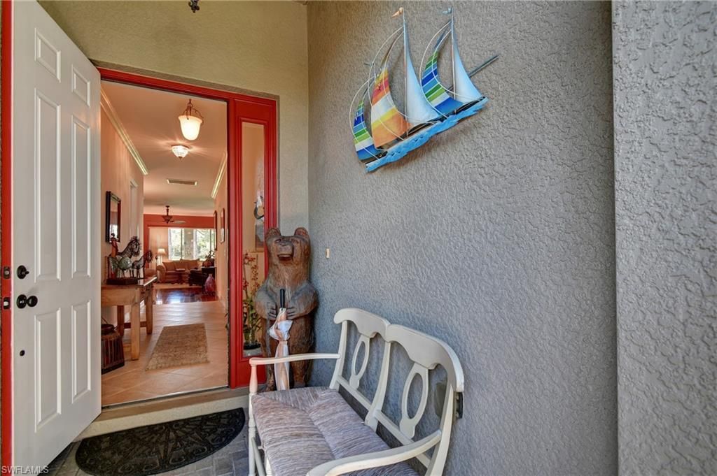 This TURNKEY golf course & sunset view 2 bed + den, 2 bath, 2 car garage home is move in ready! Just bring your suitcase and toothbrush! What you see is what you get (except for the carved bear and items stored in the garage) This home has been lovingly curated and cared for. *Please note- the actual colors are more muted than the photos convey.* Featuring a beautiful backyard view through the 4 slider door wall, a roomy screened-in lanai with a custom outdoor kitchen, you may want to spend all ...This TURNKEY golf course & sunset view 2 bed + den, 2 bath, 2 car garage home is move in ready! Just bring your suitcase and toothbrush! What you see is what you get (except for the carved bear and items stored in the garage) This home has been lovingly curated and cared for. *Please note- the actual colors are more muted than the photos convey.* Featuring a beautiful backyard view through the 4 slider door wall, a roomy screened-in lanai with a custom outdoor kitchen, you may want to spend all of your spare time sitting in your outdoor living space watching the golfers by day and the gorgeous SW Florida Sunsets by night. Newer kitchen appliances, a newer roof, pavers, screened entry, breakfast bar and a golf cart round out the great features of this home! Located in a 24-hour gate-attended community, golf memberships are available and not mandatory. The community has so much to offer- you'll find a geothermal heated community pool and spa, pickleball, tennis, bocce, ping pong, billiards, exercise room, and community center, as well as an on-site restaurant/bar & putting green. Very active social community with a full calendar of activities and events, including Food Truck nights, golf tournaments, fundraisers, bingo and children's events. Located in an X FLOOD ZONE, LOW TAXES, NO CDD and HIGH VALUE HOA make this one of the best value communities in SW Florida. Come see for yourself!