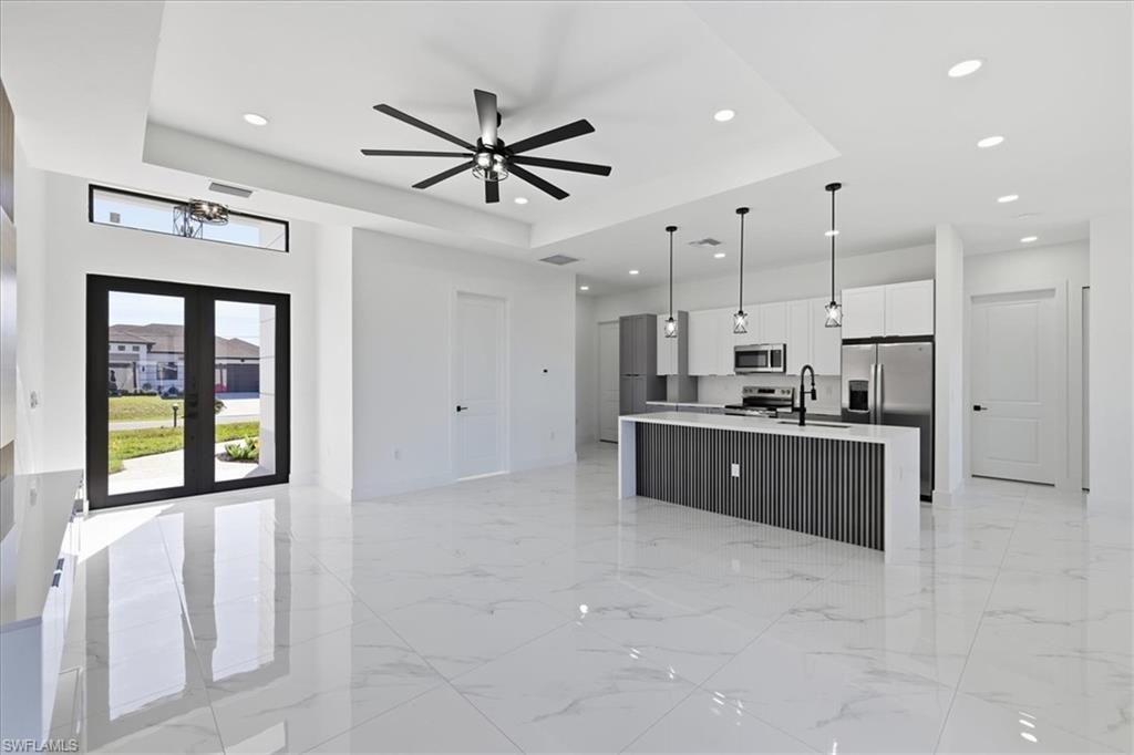 Seller contributing $10,000 towards buyers closing costs! Newly built modern home in Lehigh Acres offering 1,845 sq ft under air and 2,595 sq ft total. This 3-bedroom plus den, 3-bath residence features 10-ft ceilings, an open-concept layout, and high-end finishes throughout. Interior highlights include white porcelain tile flooring, a custom accent wall, modern lighting and ceiling fans. The kitchen is designed with sleek cabinetry, quartz countertops, and stainless-steel appliances i...Seller contributing $10,000 towards buyers closing costs! Newly built modern home in Lehigh Acres offering 1,845 sq ft under air and 2,595 sq ft total. This 3-bedroom plus den, 3-bath residence features 10-ft ceilings, an open-concept layout, and high-end finishes throughout. Interior highlights include white porcelain tile flooring, a custom accent wall, modern lighting and ceiling fans. The kitchen is designed with sleek cabinetry, quartz countertops, and stainless-steel appliances including washer and dryer. The primary suite offers a spa-inspired bathroom with freestanding soaking tub, floor-to-ceiling tile, illuminated mirrors, quartz countertops, and spacious his-and-hers built-in closets. Secondary bedrooms also feature built-in closets, with all bathrooms finished in modern vanities and full-height tile. Enjoy indoor-outdoor living with a covered lanai featuring exterior tile flooring, outdoor kitchen cabinets, sink, quartz countertops, and a dedicated pool bath with shower. This home is also equipped with impact windows and doors, full water treatment system, recessed soffit lighting, paver driveway with wraparound pavers, perimeter metal fence, and a 400-sq-ft epoxy-finished oversized garage! Dont miss out on this amazing home! Rate Relief Eligible Property! Qualified buyers may secure a reduced 30-year fixed rate through AnnieMac (Conventional, FHA, or VA options available). Seller has covered the upfront cost to lock the rate for this property. Buyer must apply with AnnieMac and meet underwriting guidelines. Limited-time availability. Contact listing agent for full details and disclosures.