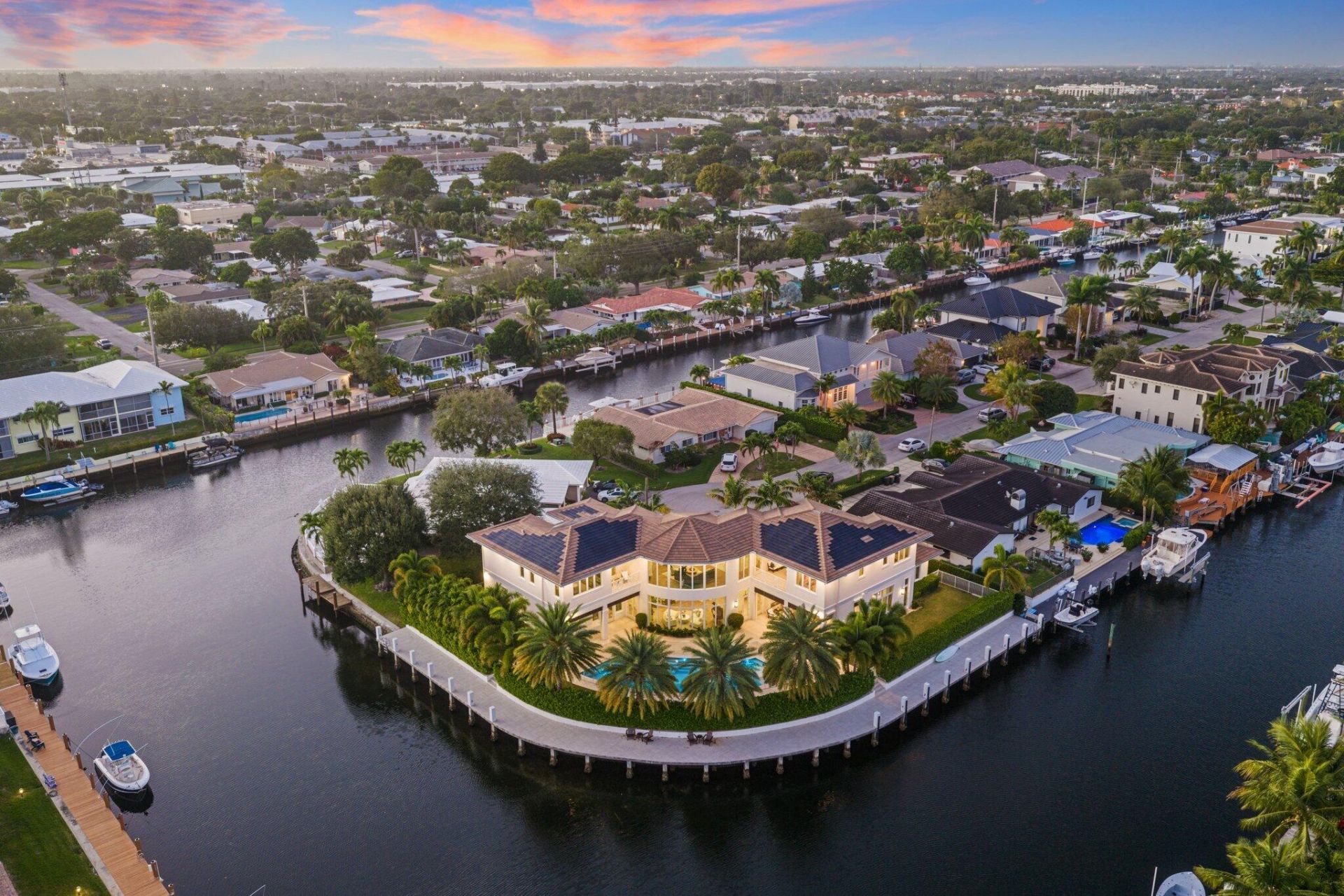 Located on a 240-foot southeast-facing waterfront point lot on the South Grand Canal, this Hamptons-inspired estate offers timeless design, modern technology, and exceptional indoor-outdoor living. Built in 2020 by Zahn Builders of Lighthouse Point, the home features refined millwork, coffered ceilings, soaring ceiling heights, and expansive windows that fill the interiors with natural light.The grand foyer opens to formal living and dining spaces with a 500+ bottle refrigerated wine bar, ideal ...Located on a 240-foot southeast-facing waterfront point lot on the South Grand Canal, this Hamptons-inspired estate offers timeless design, modern technology, and exceptional indoor-outdoor living. Built in 2020 by Zahn Builders of Lighthouse Point, the home features refined millwork, coffered ceilings, soaring ceiling heights, and expansive windows that fill the interiors with natural light.The grand foyer opens to formal living and dining spaces with a 500+ bottle refrigerated wine bar, ideal for entertaining. Walls of glass lead to a resort-style outdoor kitchen, private pool framed by lush hedging, orchid sanctuary, courtyard, and fenced areas perfect for pets and children.The thoughtfully designed layout includes a first-floor secondary primary suite, private office, and two powder rooms. Upstairs are five en-suite bedrooms with walk-in closets, including a luxurious primary suite, plus an upstairs club room with bar, expansive loggia, oversized pantry, and three-car garage.A fully integrated smart-home system features Lutron lighting and shades, enterprise-grade whole-home Wi-Fi, security cameras, smart locks, thermostats, and Apple HomeKit with Siri control. An architecturally integrated solar tile roof with a 22.5 kW system and three Tesla Powerwalls provides whole-home backup, off-grid capability, and netmetering for reduced utility costs.A rare opportunity to own a technologically advanced waterfront estate on one of the largest single-family lots in Lighthouse Point.